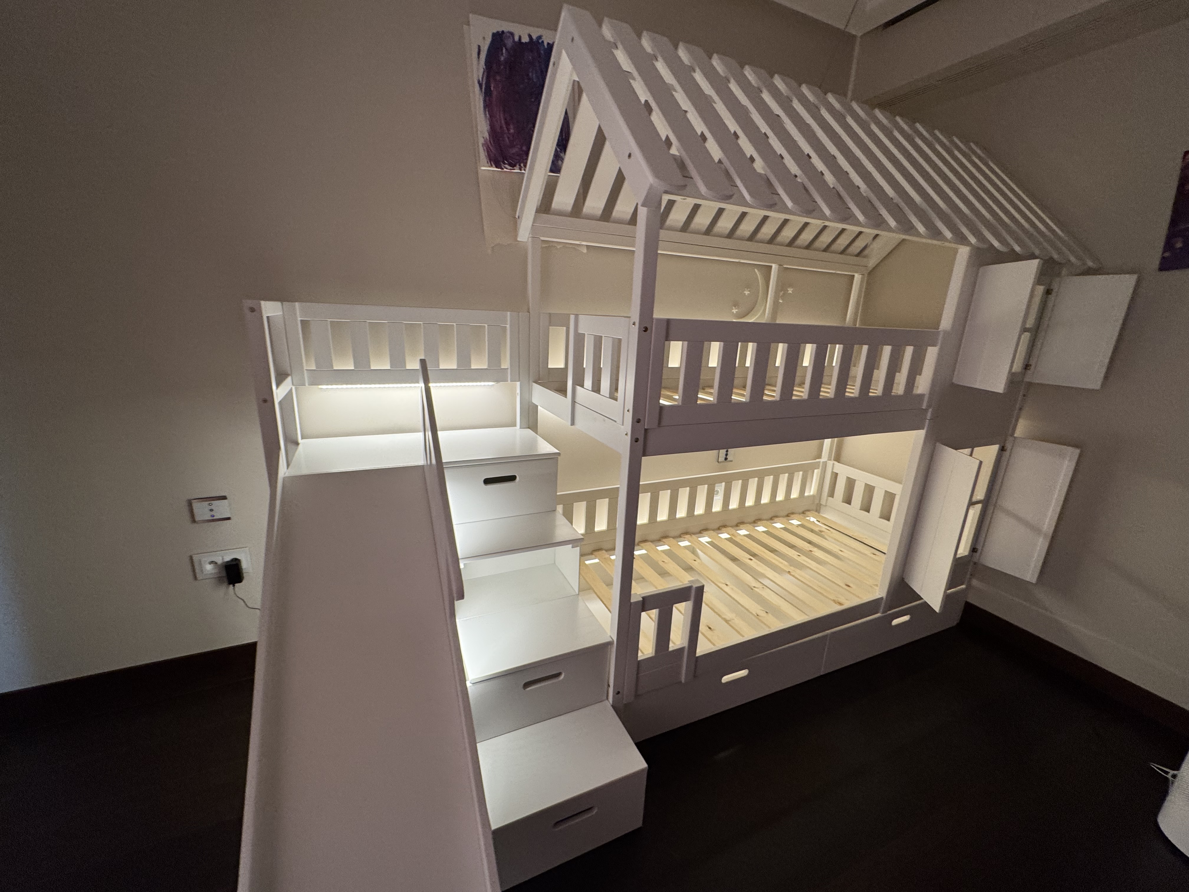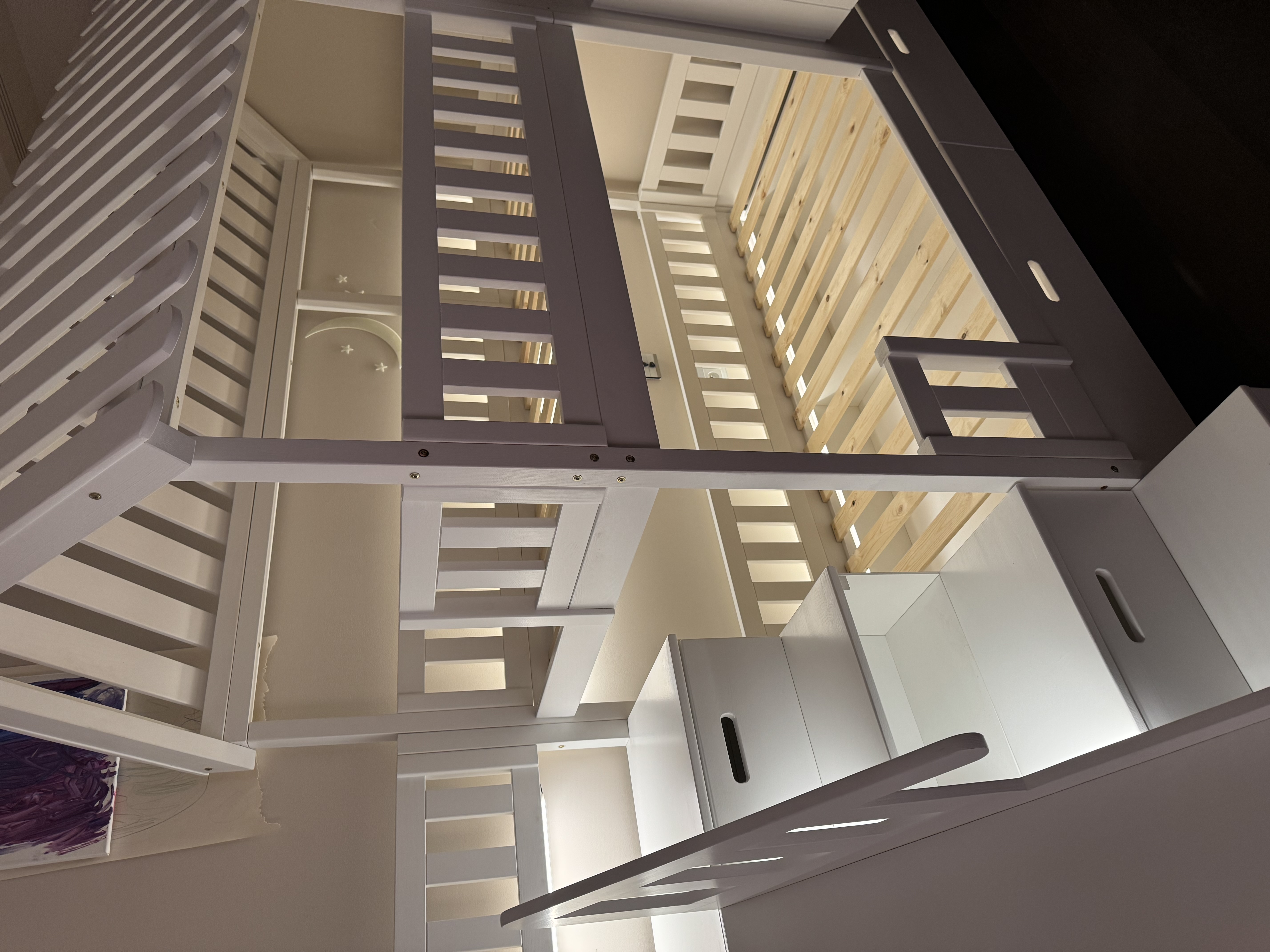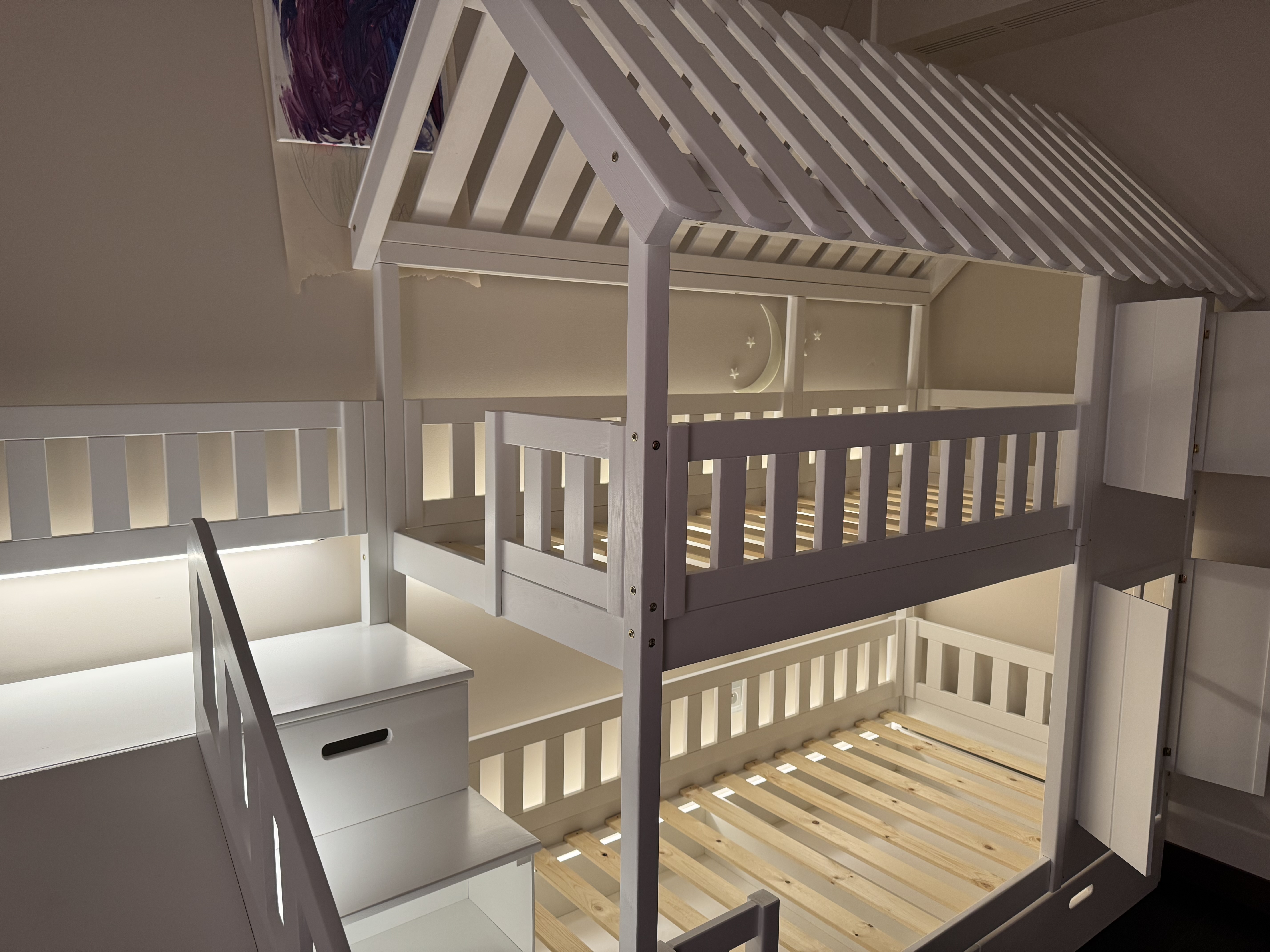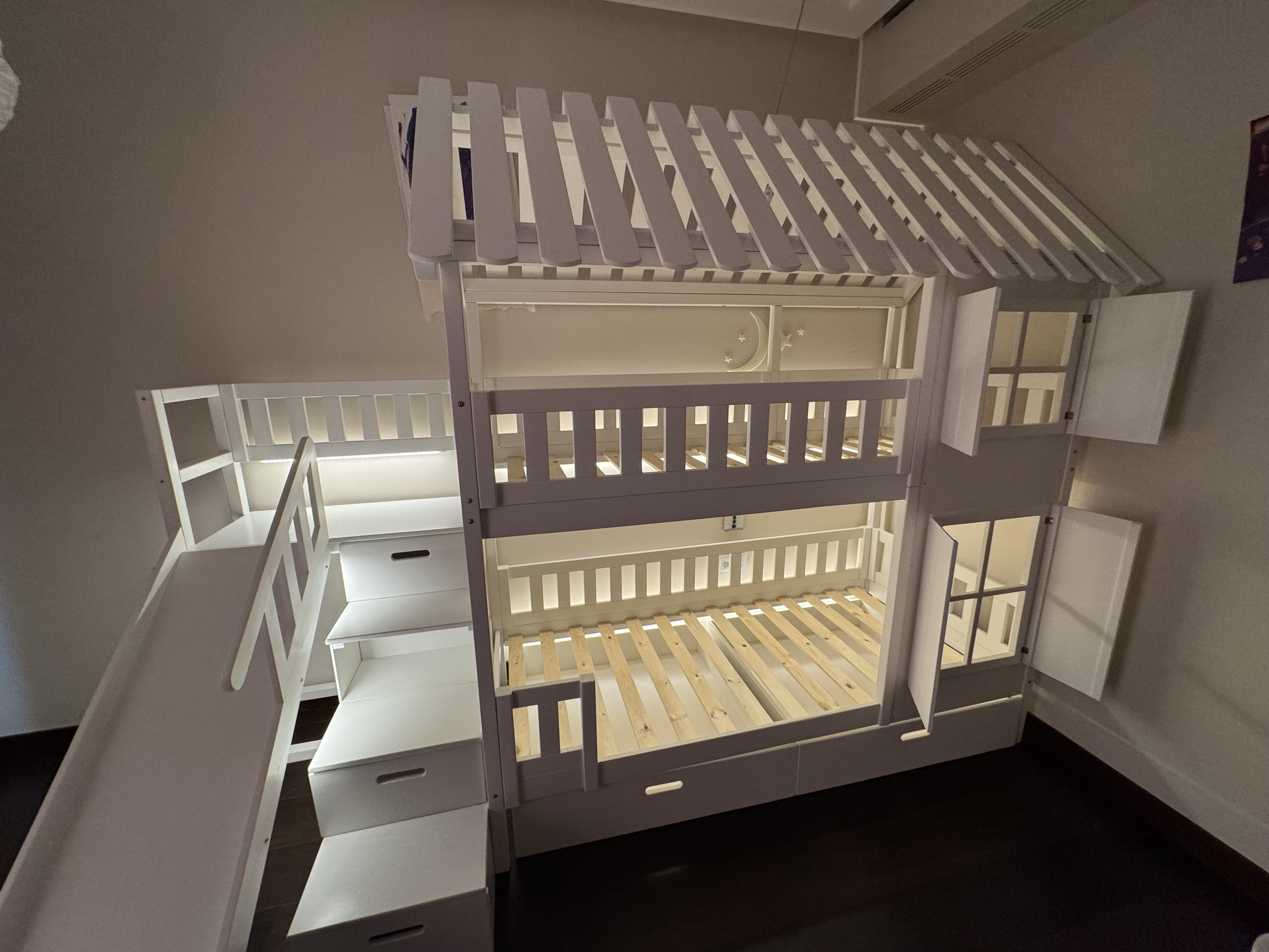 Biel to kolor uniwersalny i ponadczasowy. Łóżko piętrowe z oświetleniem ze schodami i ślizgawką w kolorze białym pasuje zarówno do pokoju chłopca, jak i dziewczynki. Ułatwia zmianę aranżacji wraz z wiekiem dziecka.