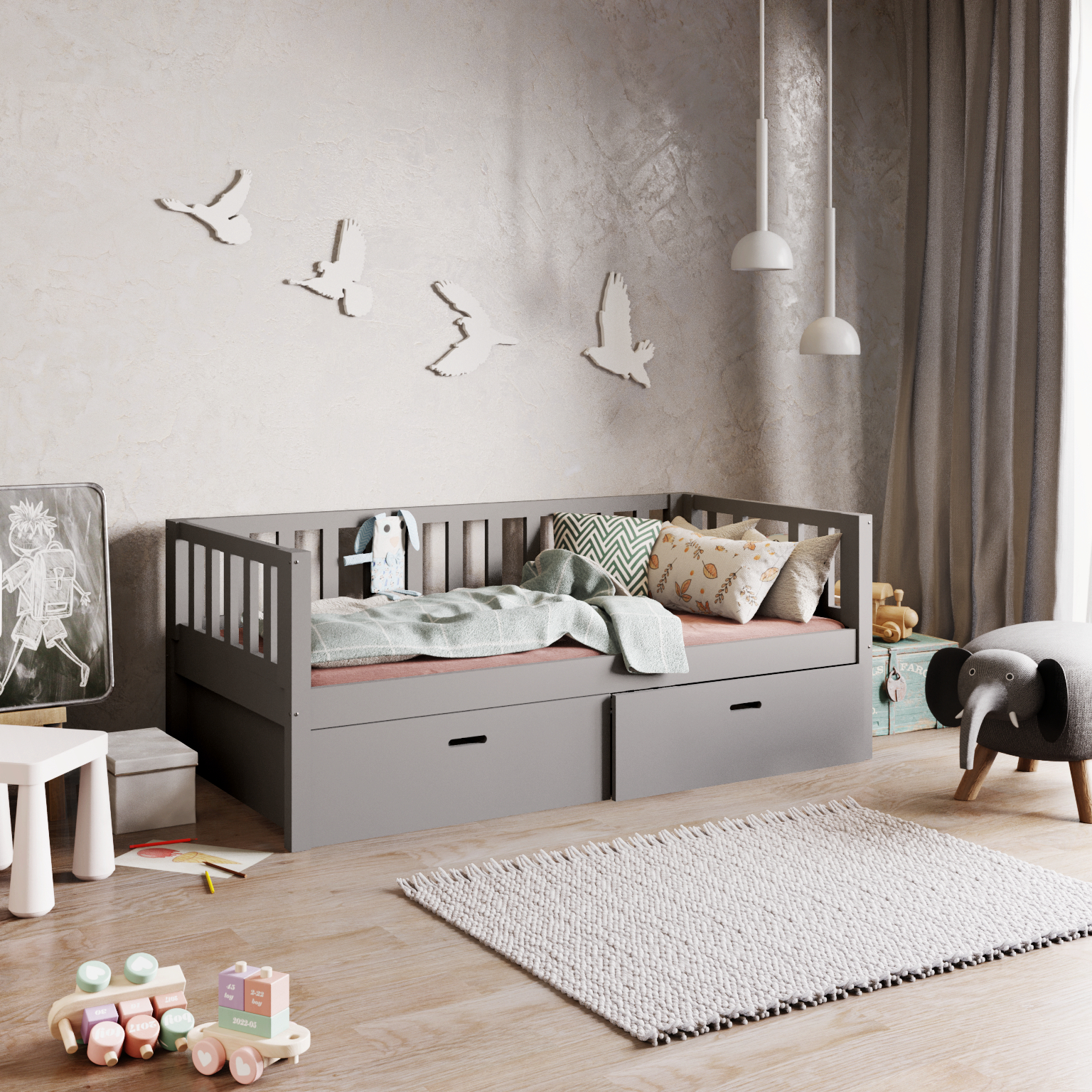 szare Drewniane łóżeczko dla dzieci z szufladami