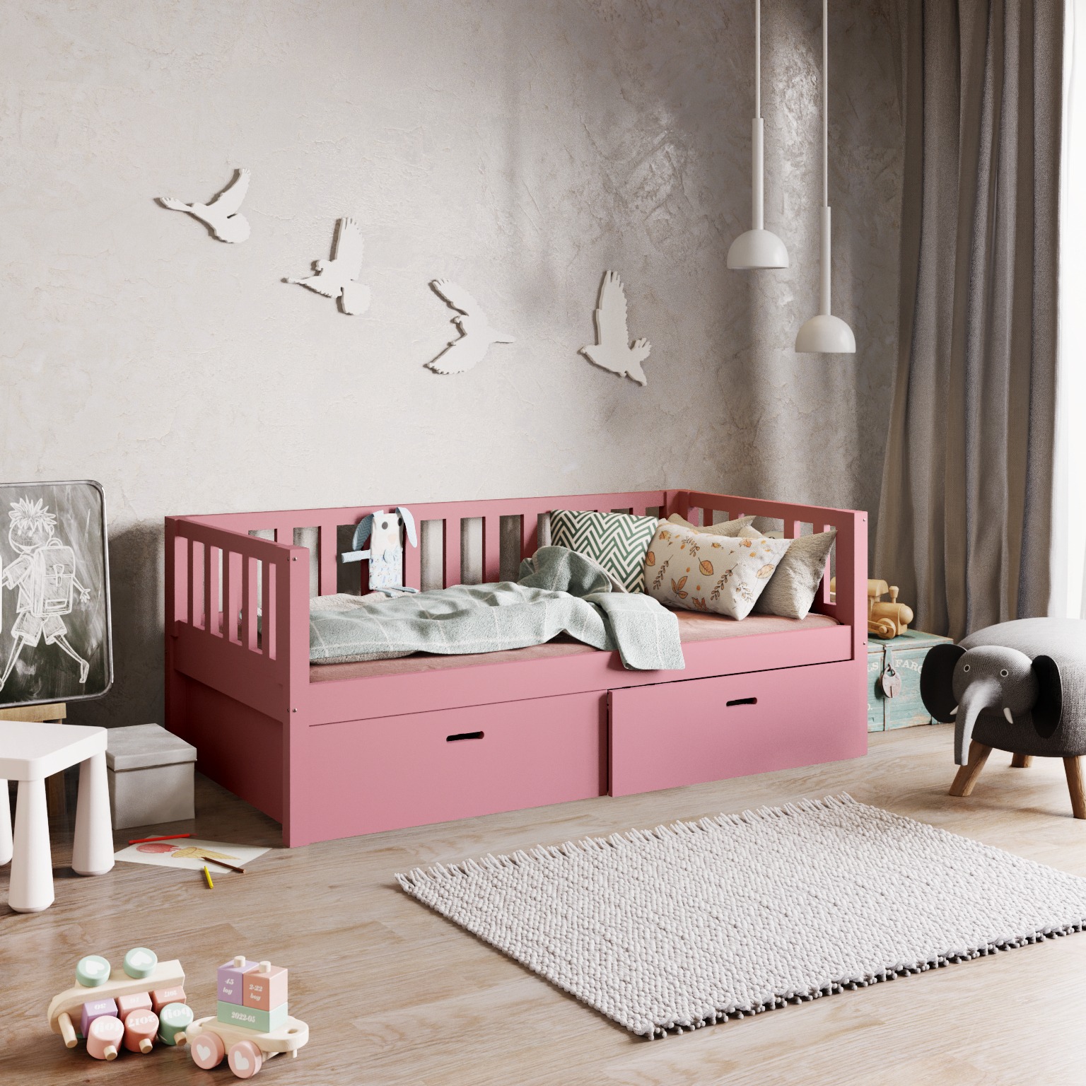 różowe Drewniane łóżeczko dla dzieci z szufladami