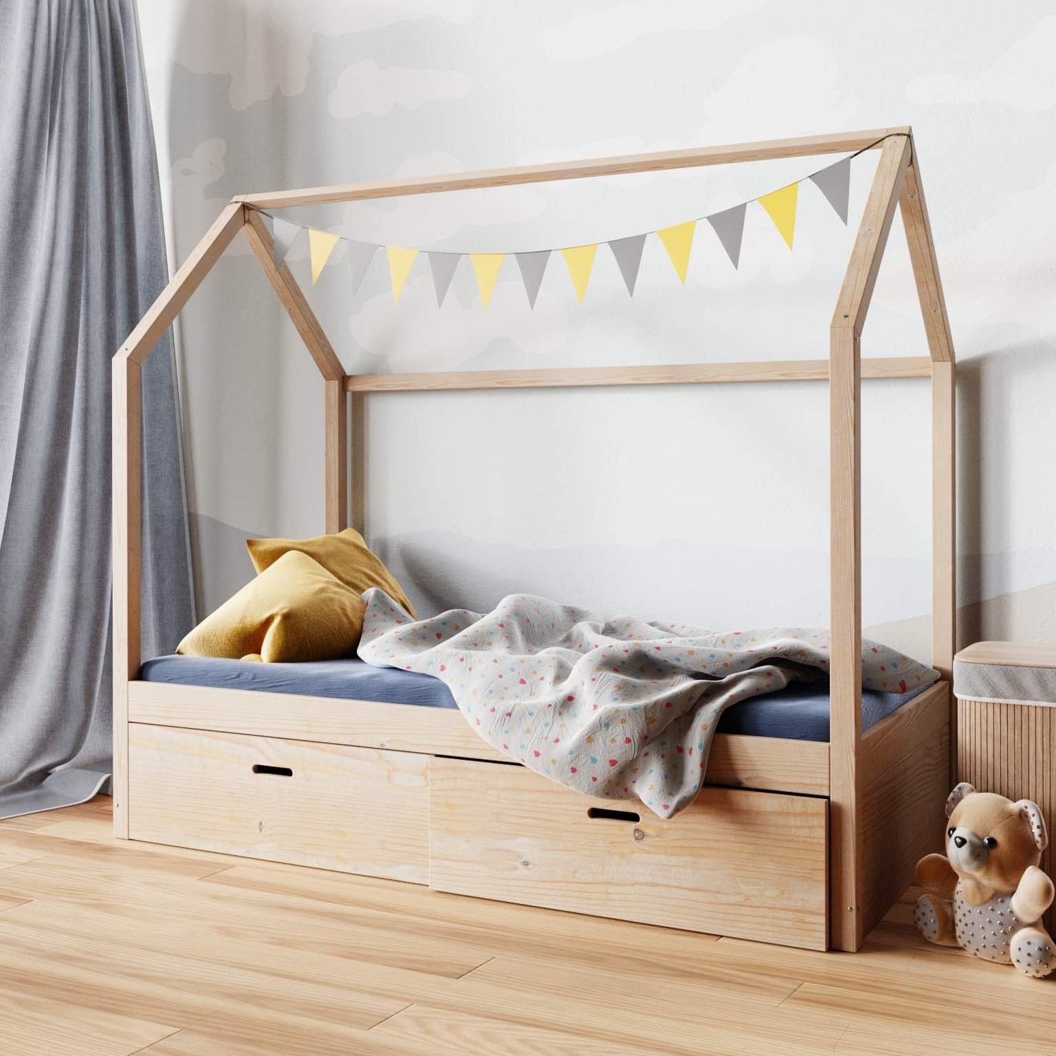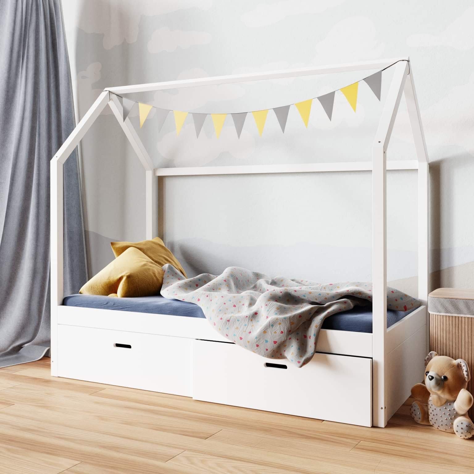 Forma domku sprawia, że łóżeczko domek z szufladami bez barierek staje się głównym punktem aranżacji pokoju. Prosta konstrukcja daje możliwość dekorowania girlandami świetlnymi, baldachimem czy poduszkami, dzięki czemu przestrzeń można łatwo dopasować do wieku i zainteresowań dziecka.