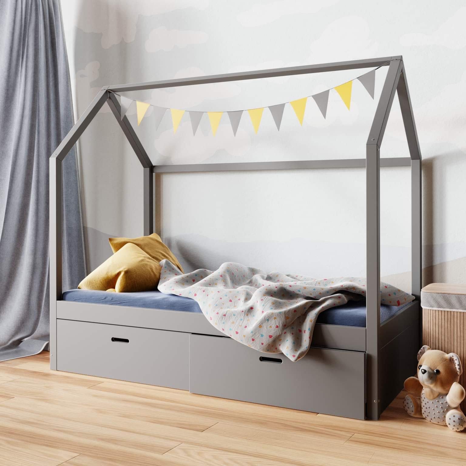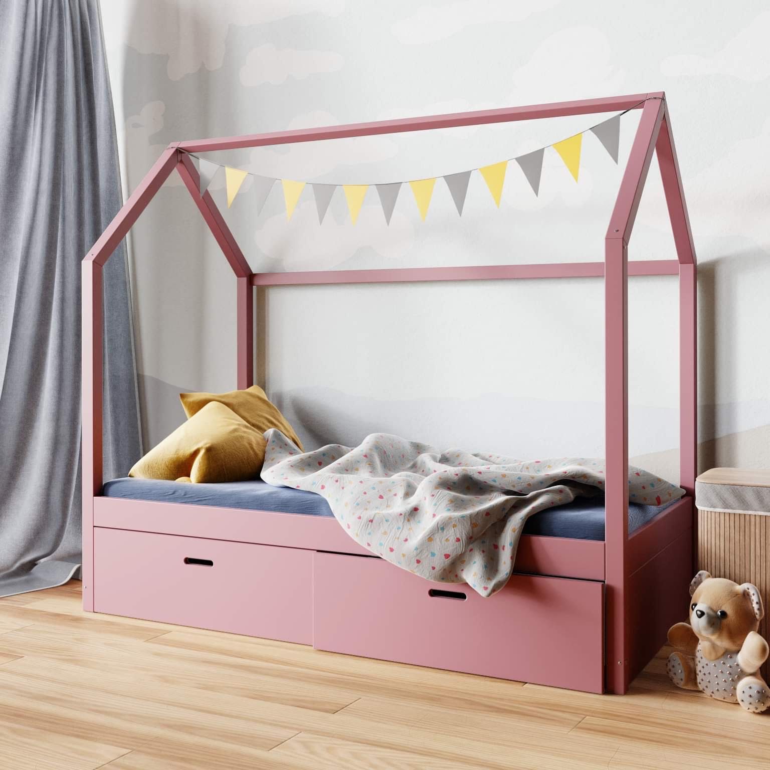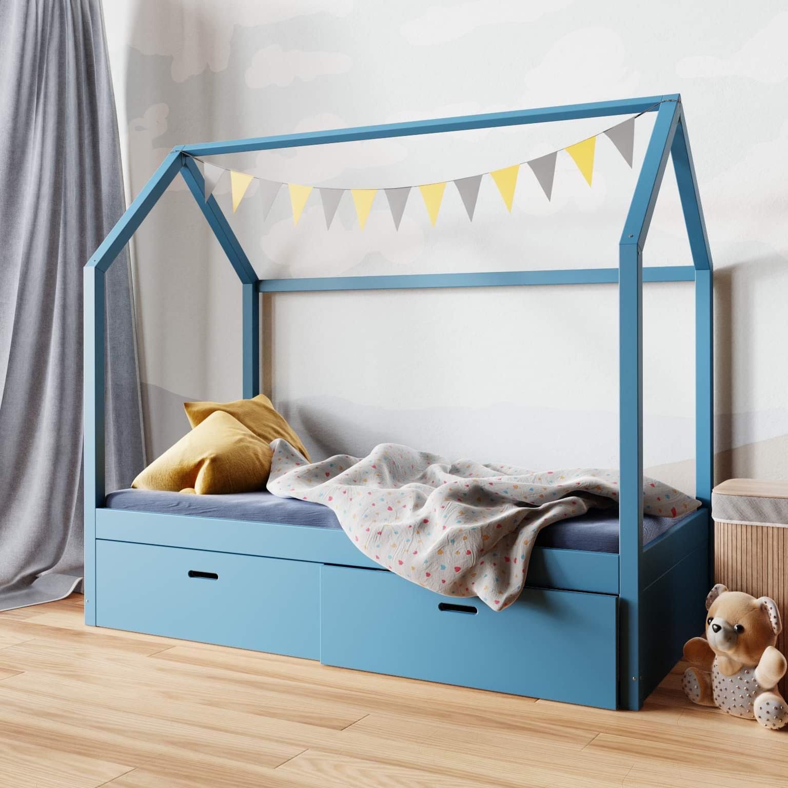 Praktyczne szuflady umieszczone pod konstrukcją pozwalają przechowywać pościel, koce, ubrania lub zabawki. Łóżeczko domek z szufladami bez barierek pomaga utrzymać porządek bez potrzeby wstawiania dodatkowych komód czy pojemników.