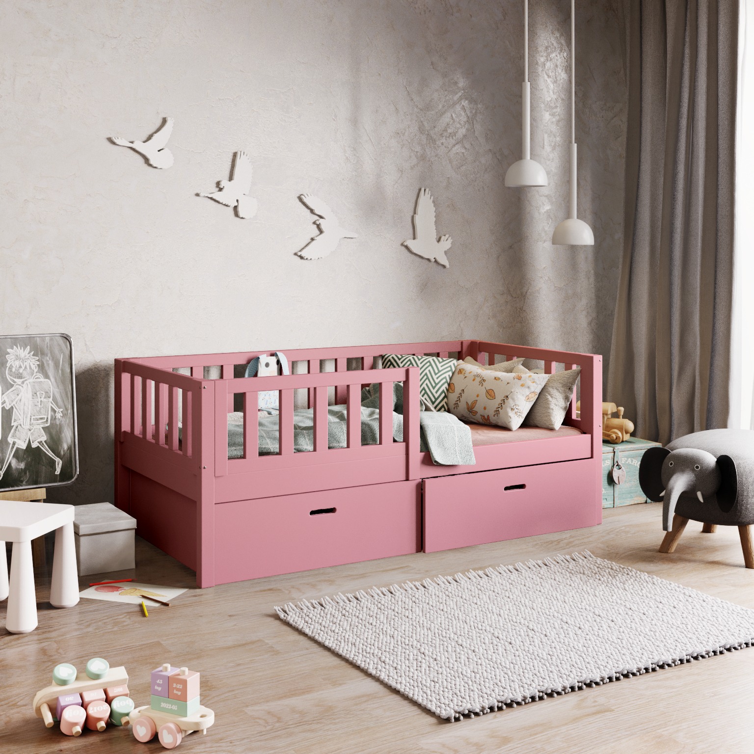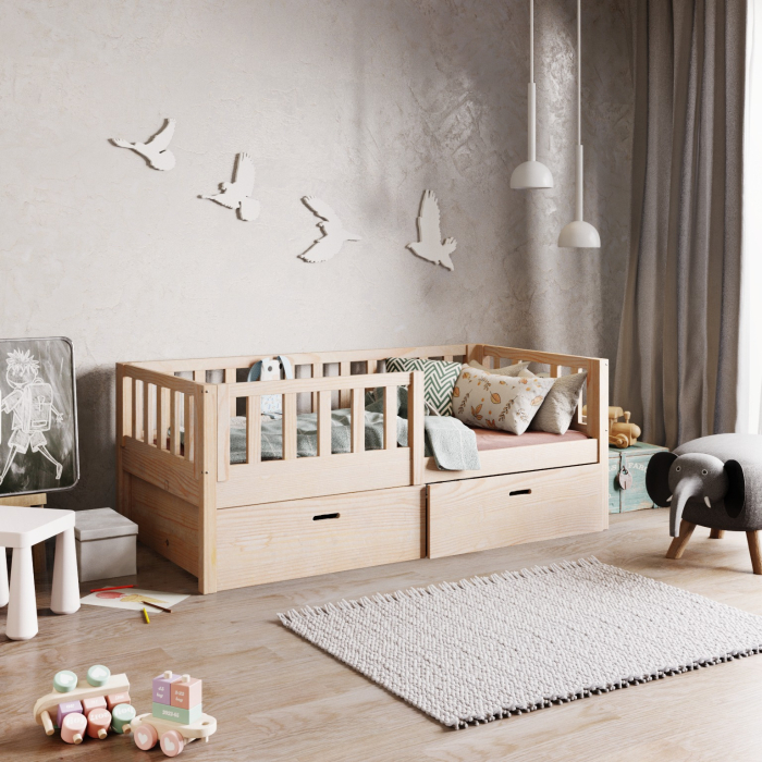 Łóżeczko dziecięce z barierkami i dużymi szufladami wyposażone jest w solidne zabezpieczenia boczne, które ograniczają ryzyko wypadnięcia podczas snu. Konstrukcja barierek jest stabilna i dopasowana do wysokości materaca, co zwiększa komfort użytkowania.