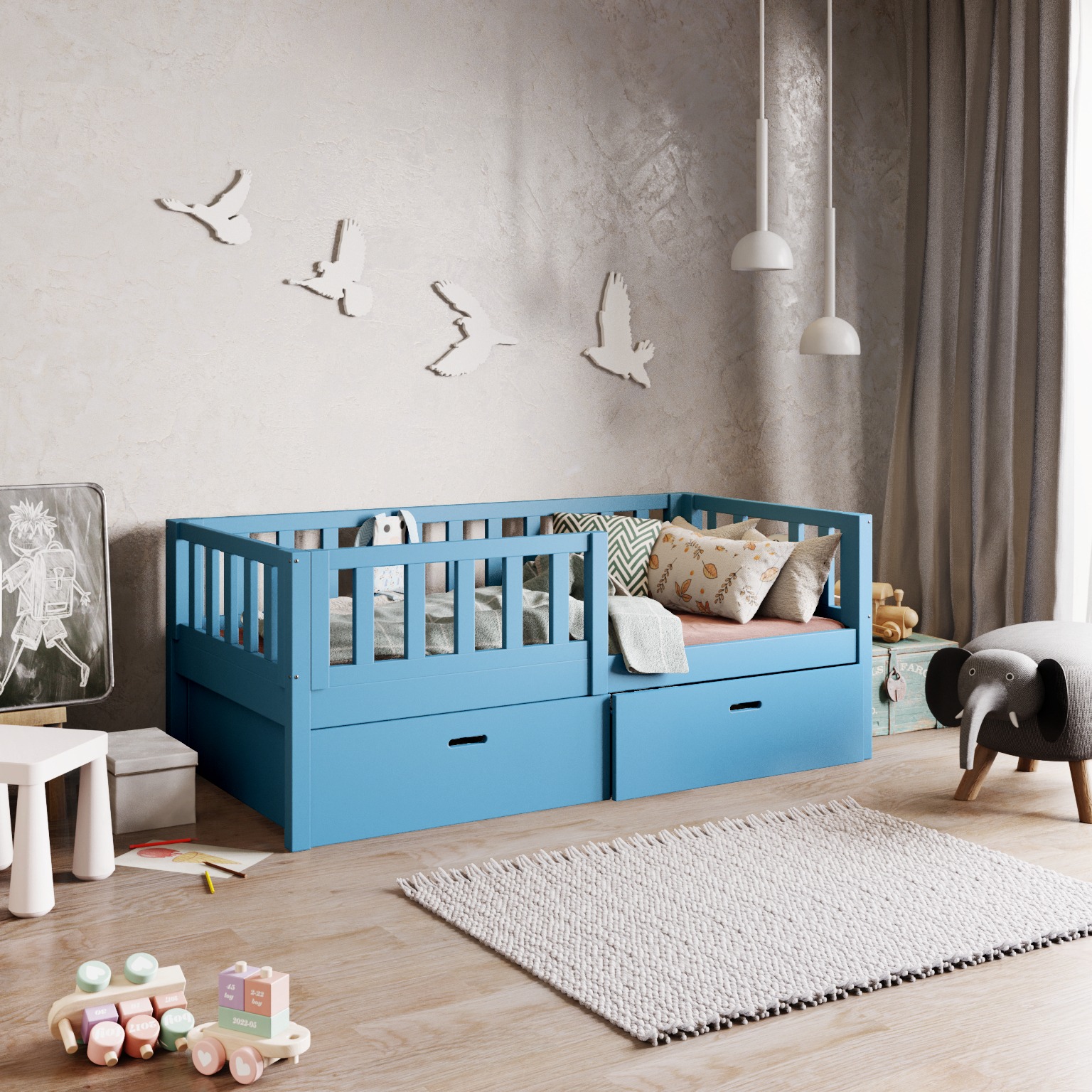 Jedną z największych zalet tego modelu są pojemne szuflady umieszczone pod łóżkiem. Łóżeczko dziecięce z barierkami i dużymi szufladami pozwala przechowywać pościel, koce, zabawki czy ubrania, dzięki czemu pokój dziecka pozostaje uporządkowany.