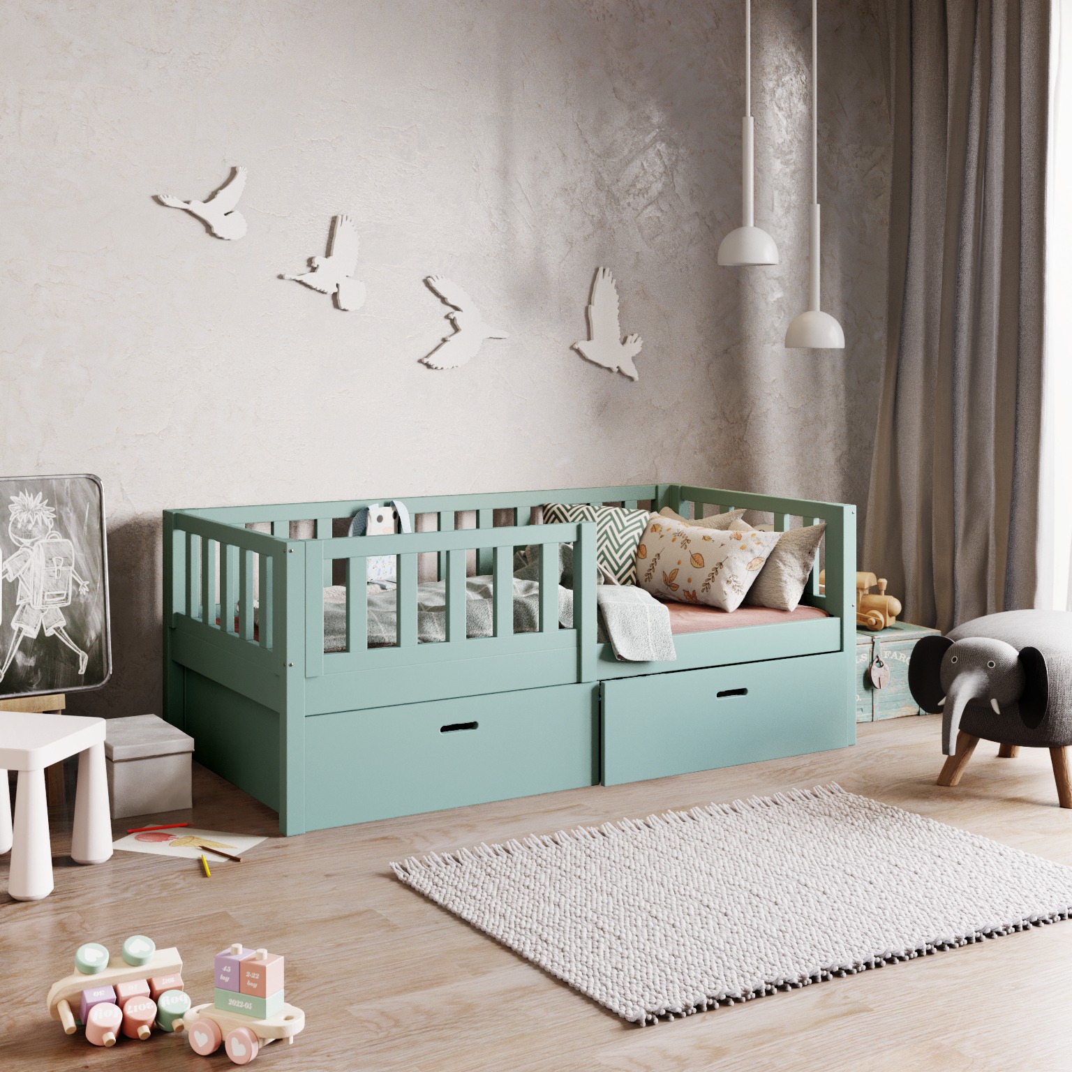 Solidne materiały i staranne wykonanie gwarantują trwałość oraz odporność na codzienne użytkowanie. Łóżeczko dziecięce z barierkami i dużymi szufladami łączy estetykę z funkcjonalnością, co czyni je praktycznym wyborem na lata.