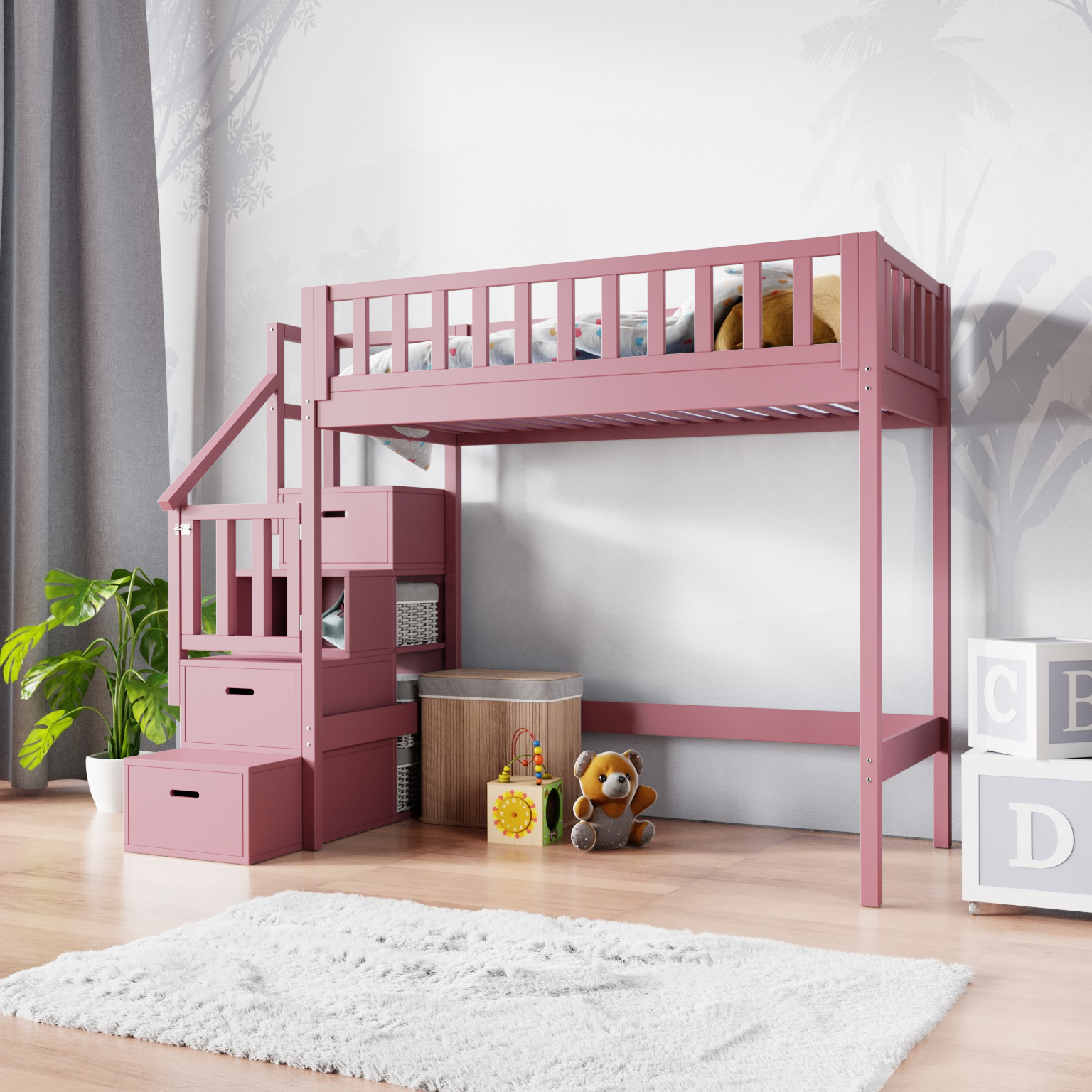 różowe łóżko ze schodami