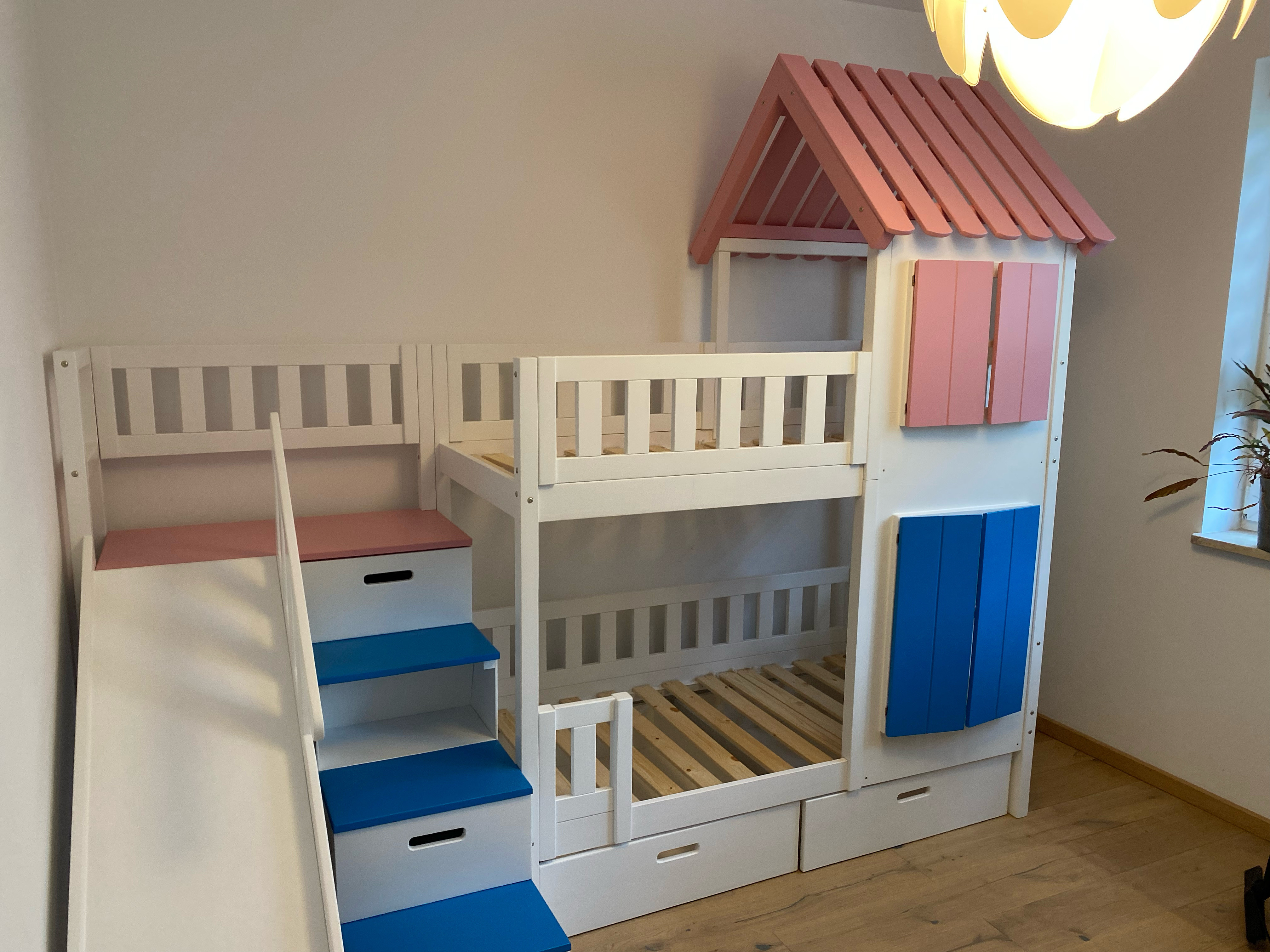 Łóżko piętrowe dla chłopca i dziewczynki to przemyślane rozwiązanie stworzone z myślą o rodzeństwie, które dzieli jeden pokój. Konstrukcja łączy funkcję miejsca do snu z przestrzenią do zabawy, a dodatkowe elementy takie jak ślizgawka, schody, daszek, okna i okiennice nadają mu wyjątkowy charakter.