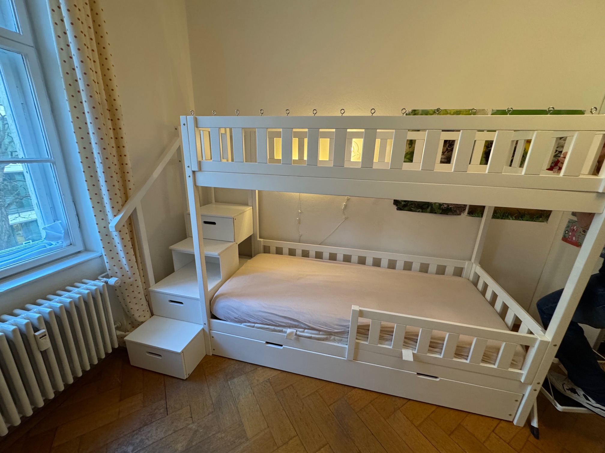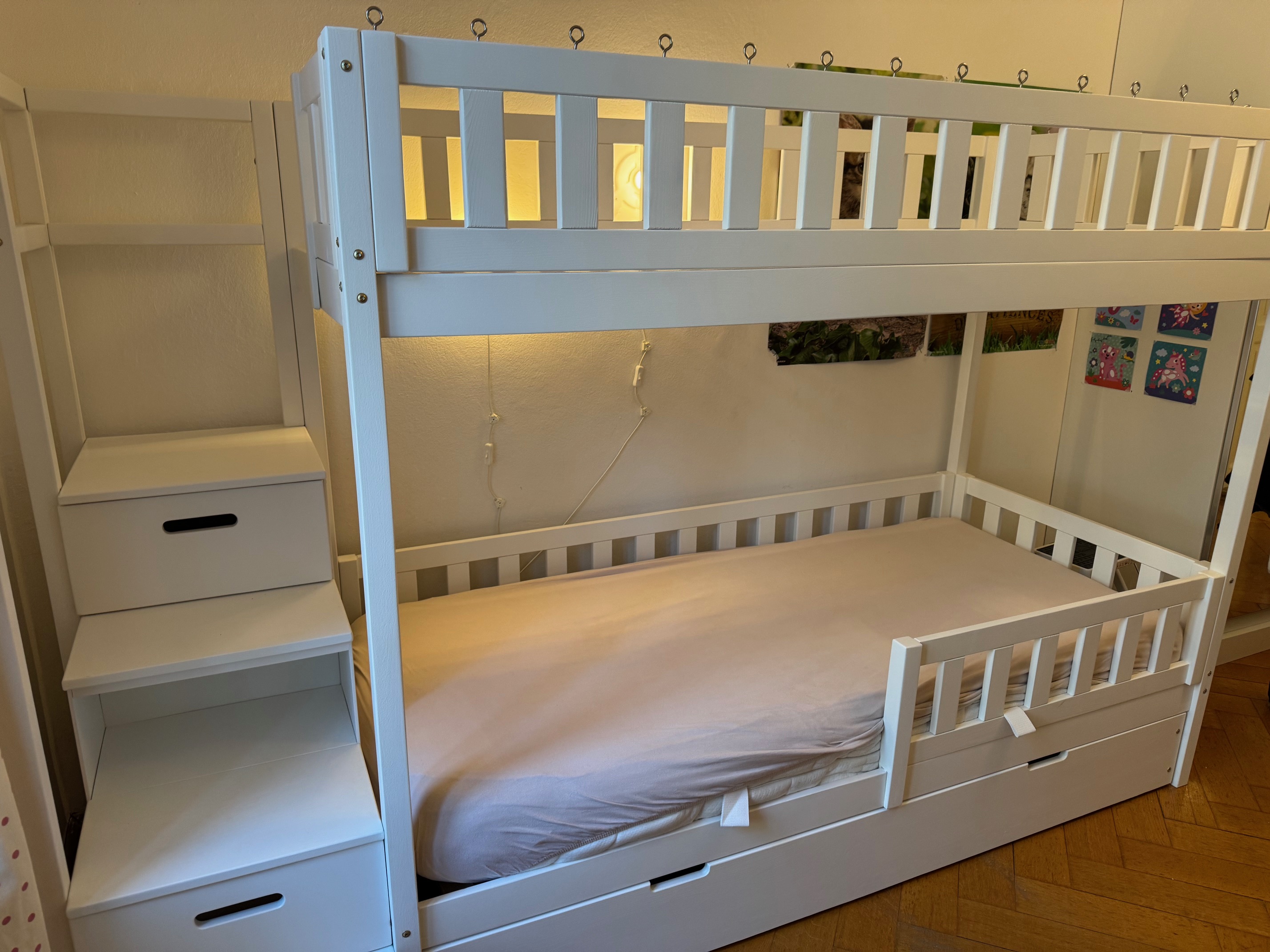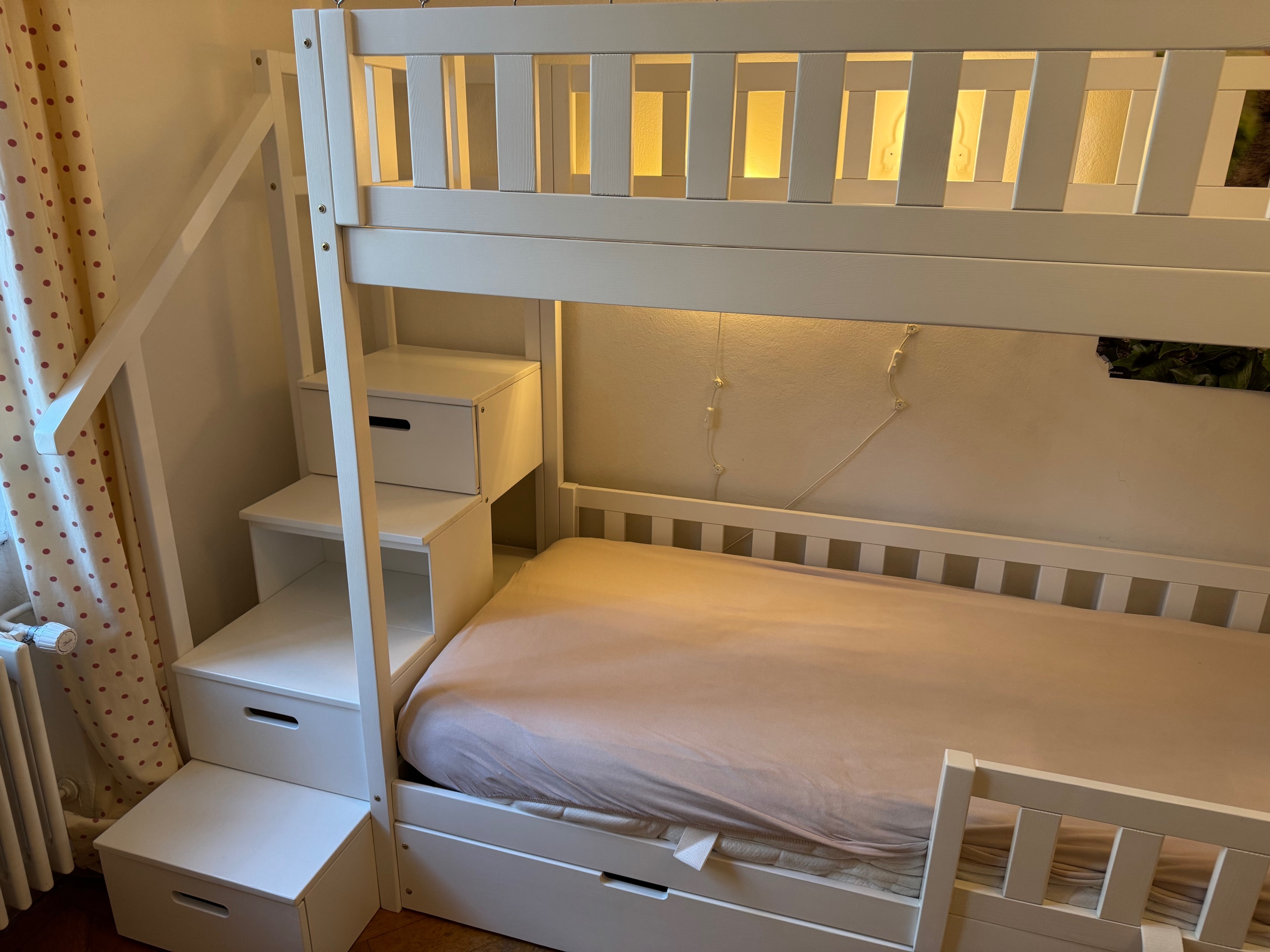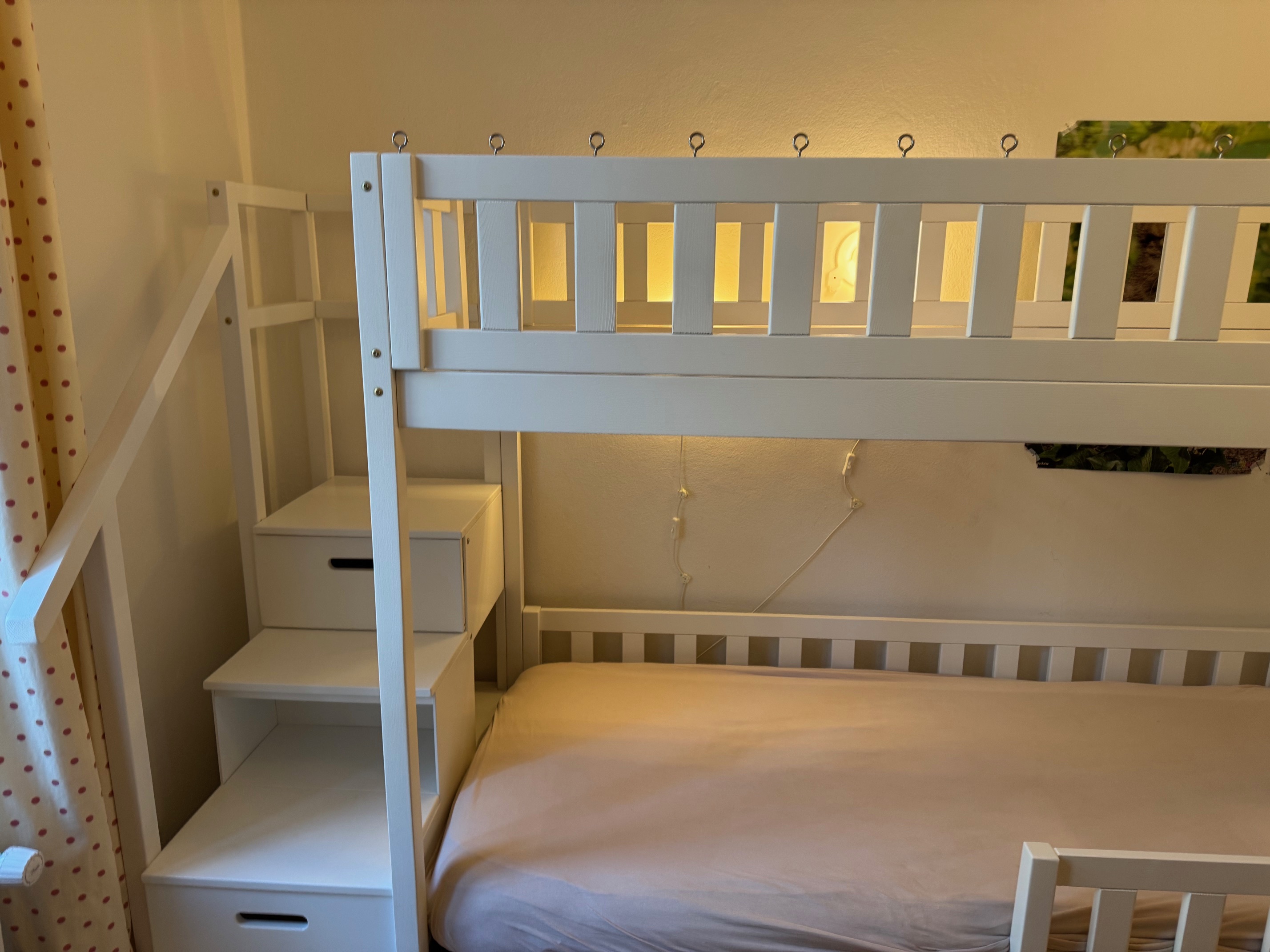 Stabilne schody zamiast drabinki sprawiają, że łóżko piętrowe jest wygodne i bezpieczne w codziennym użytkowaniu.