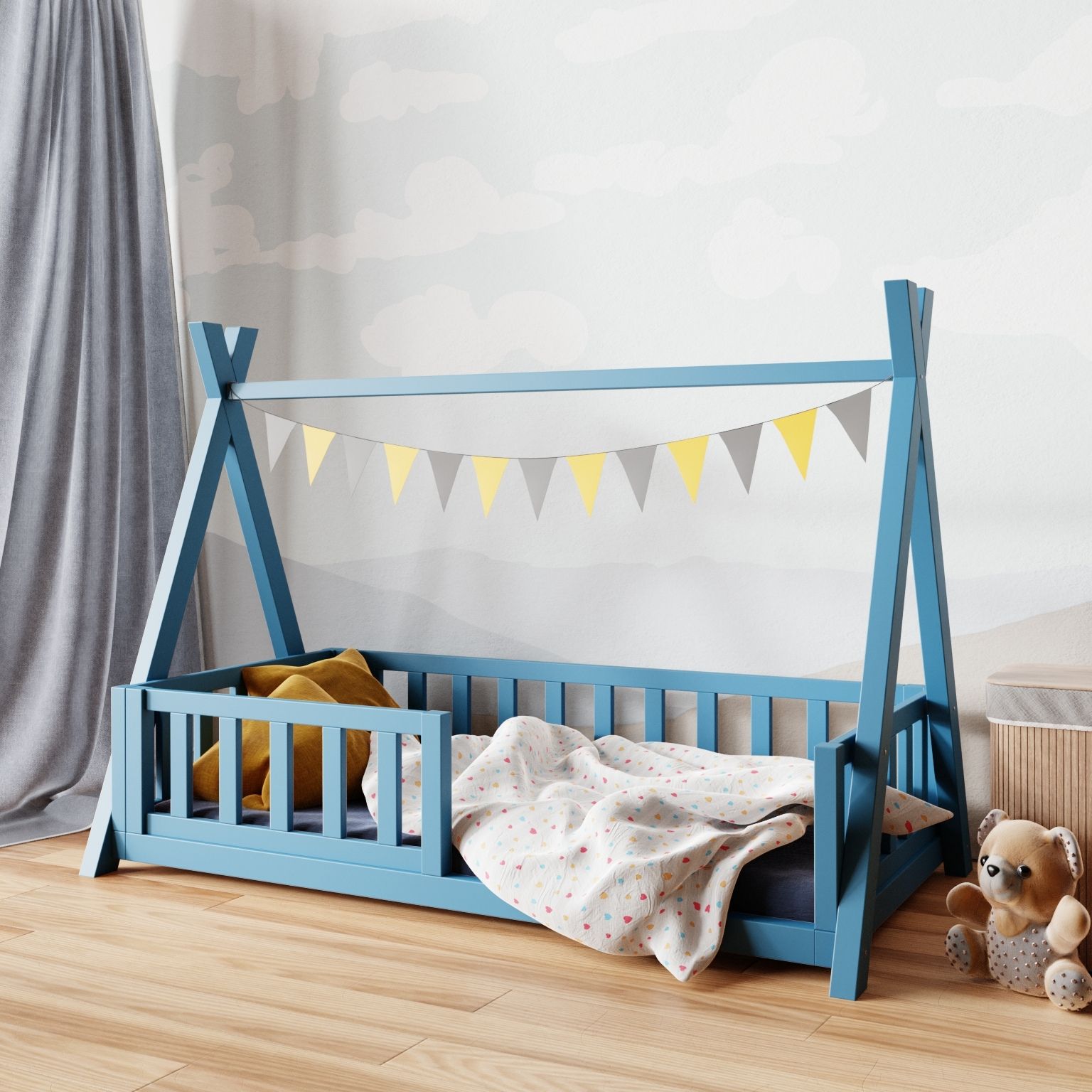 Łóżko tipi z barierkami to połączenie wyjątkowego designu inspirowanego namiotem indiańskim z funkcjonalnym zabezpieczeniem dla młodszych dzieci. Charakterystyczna konstrukcja w kształcie tipi tworzy przytulną atmosferę w pokoju, a boczne barierki zwiększają bezpieczeństwo podczas snu.