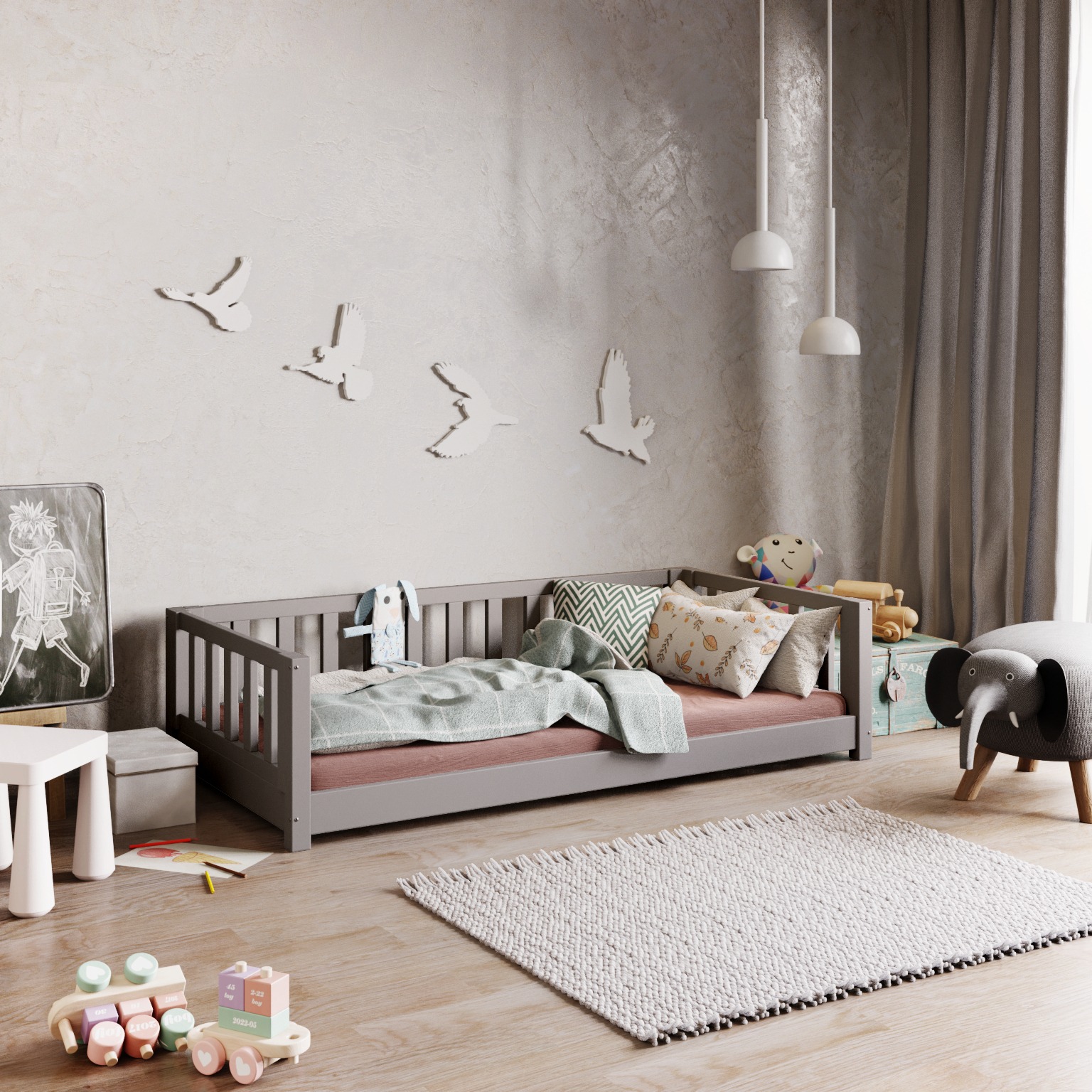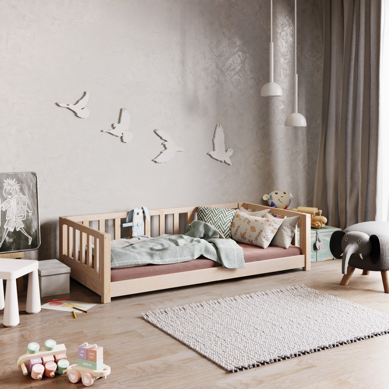 Stabilne zabezpieczenia boczne zostały zaprojektowane tak, aby zapewnić odpowiedni poziom ochrony przy zachowaniu wygody. Niskie łóżeczko dziecięce z barierkami łączy bezpieczeństwo z estetyką i nie przytłacza wnętrza.