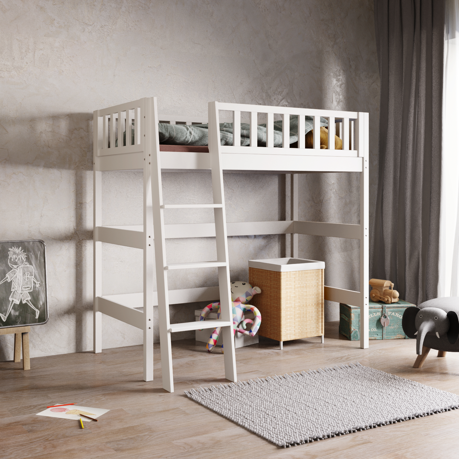 Stabilna i solidna drabina od frontu zapewnia łatwy i szybki dostęp do górnego łóżka. Taki układ pozwala ustawić łóżko przy ścianie lub w narożniku pokoju, maksymalnie wykorzystując dostępną przestrzeń. Barierki ochronne wokół materaca sprawiają, że dziecko śpi spokojnie i bezpiecznie każdej nocy.