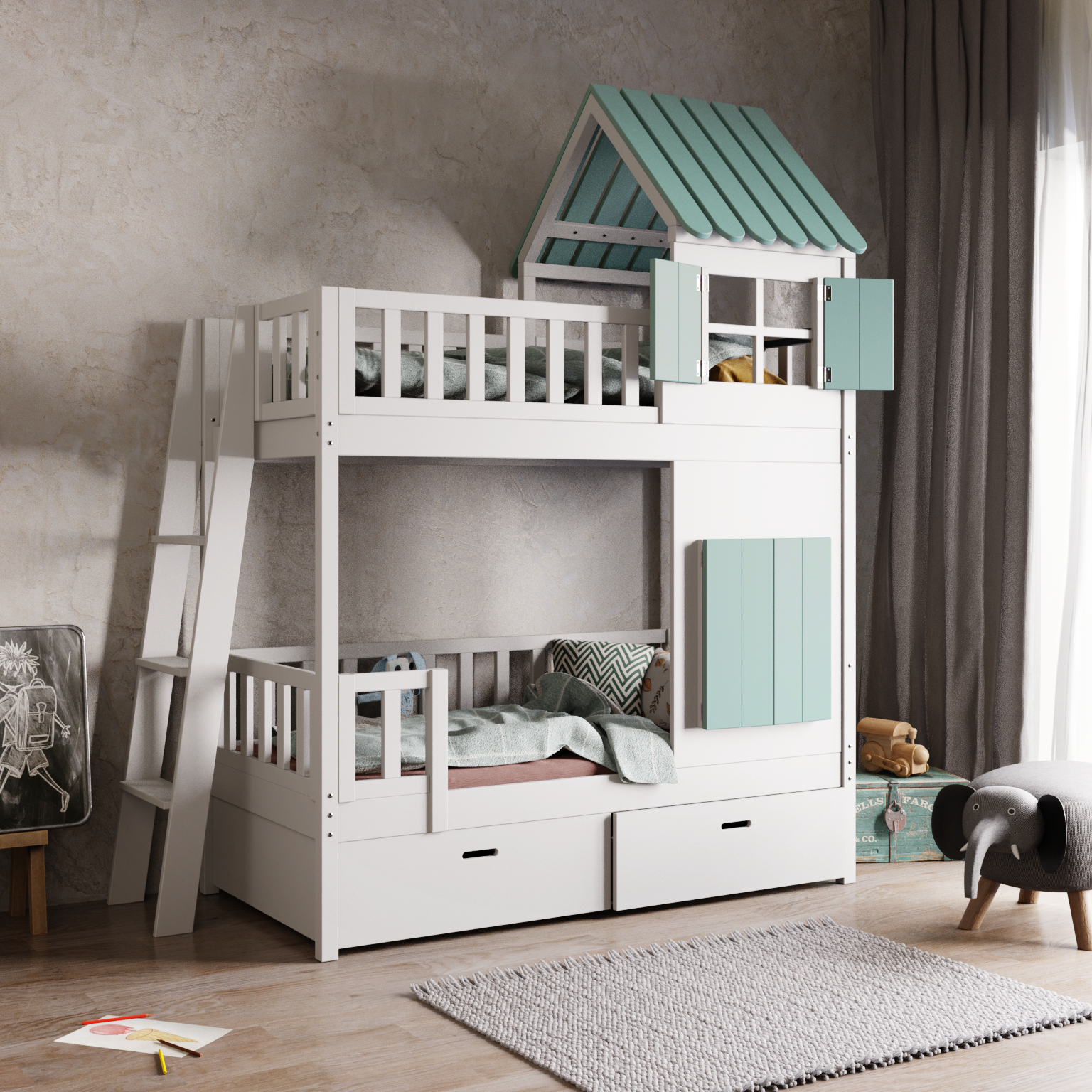 Na górze znajduje się przytulne miejsce do spania z daszkiem i oknem, które tworzy wrażenie prawdziwego domku. Na dole – dodatkowa przestrzeń z okiennicami, idealna do zabawy lub jako drugi kącik do spania. To łóżko piętrowe dla dzieci, które pobudza wyobraźnię i daje poczucie prywatności.